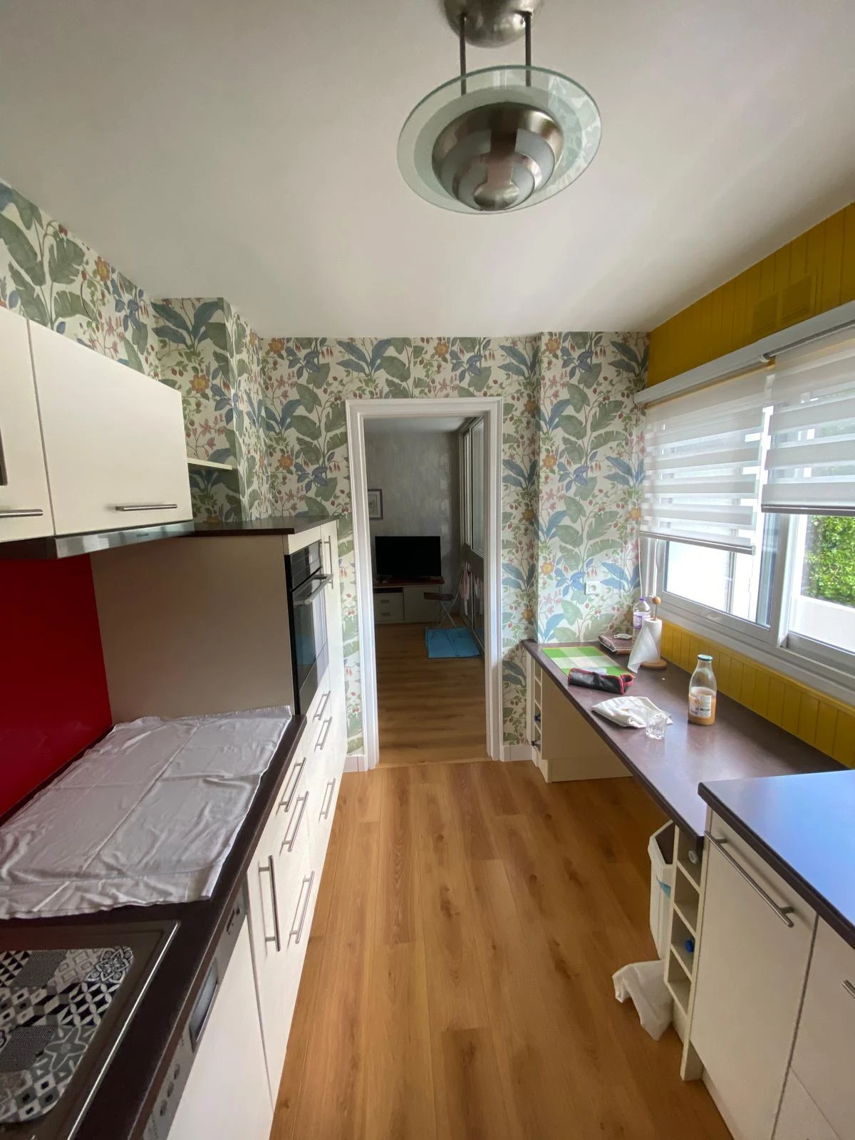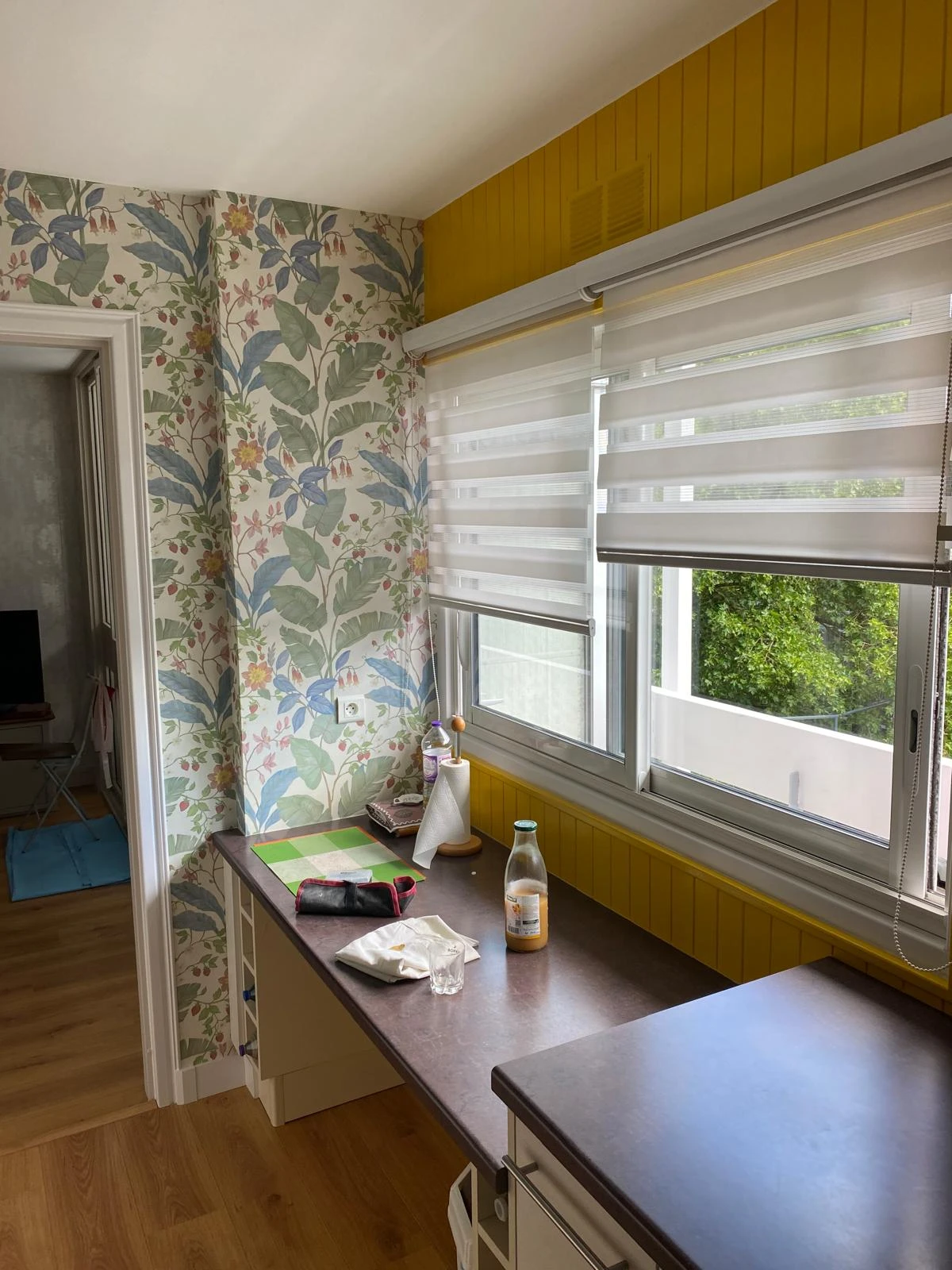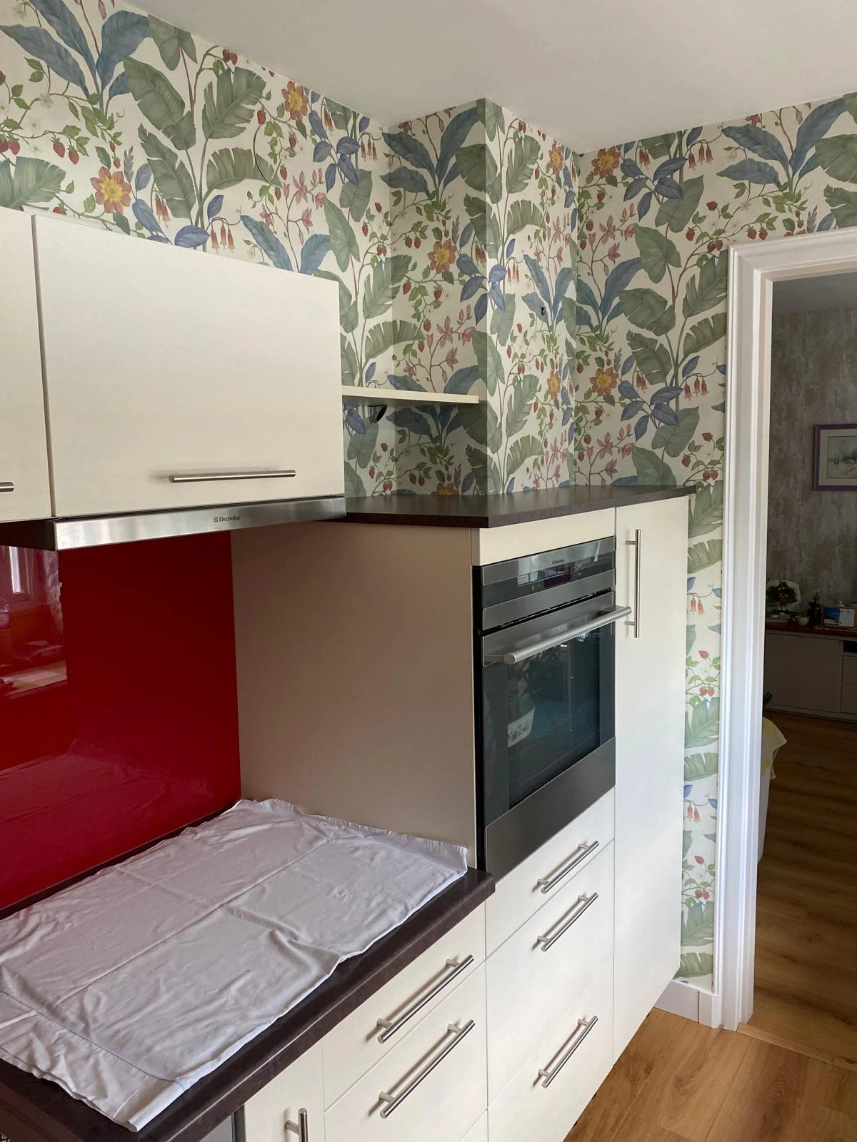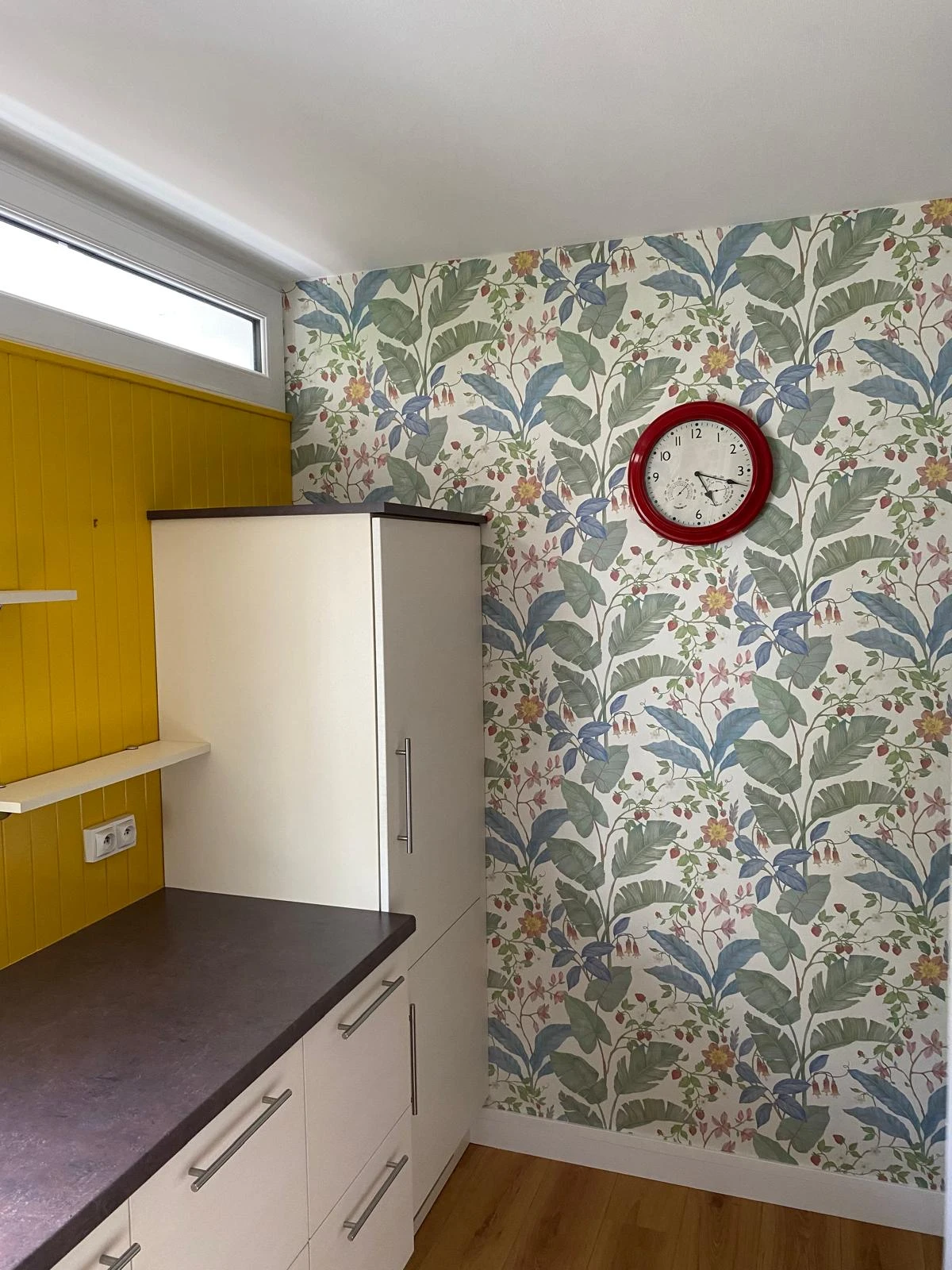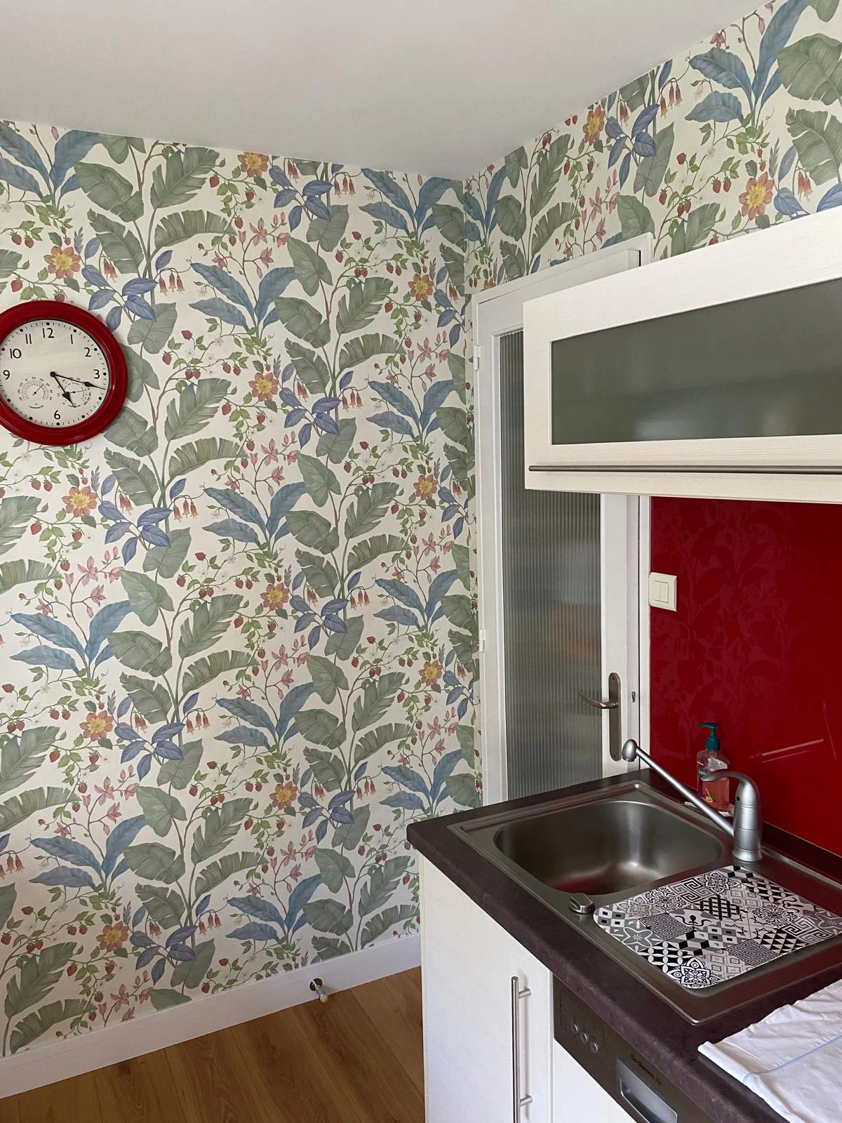 Pose de papier peint et mise en peinture d'un bardage dans une cuisine à Rennes.